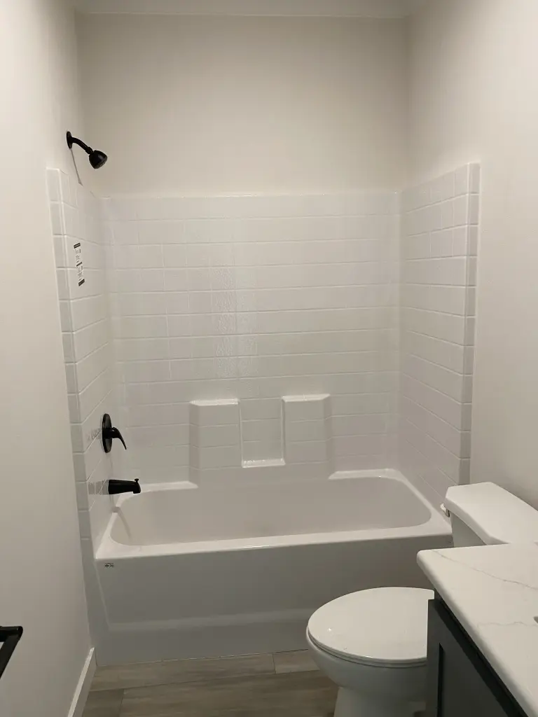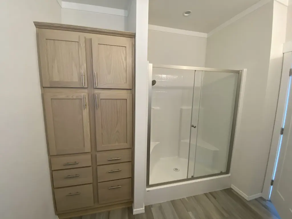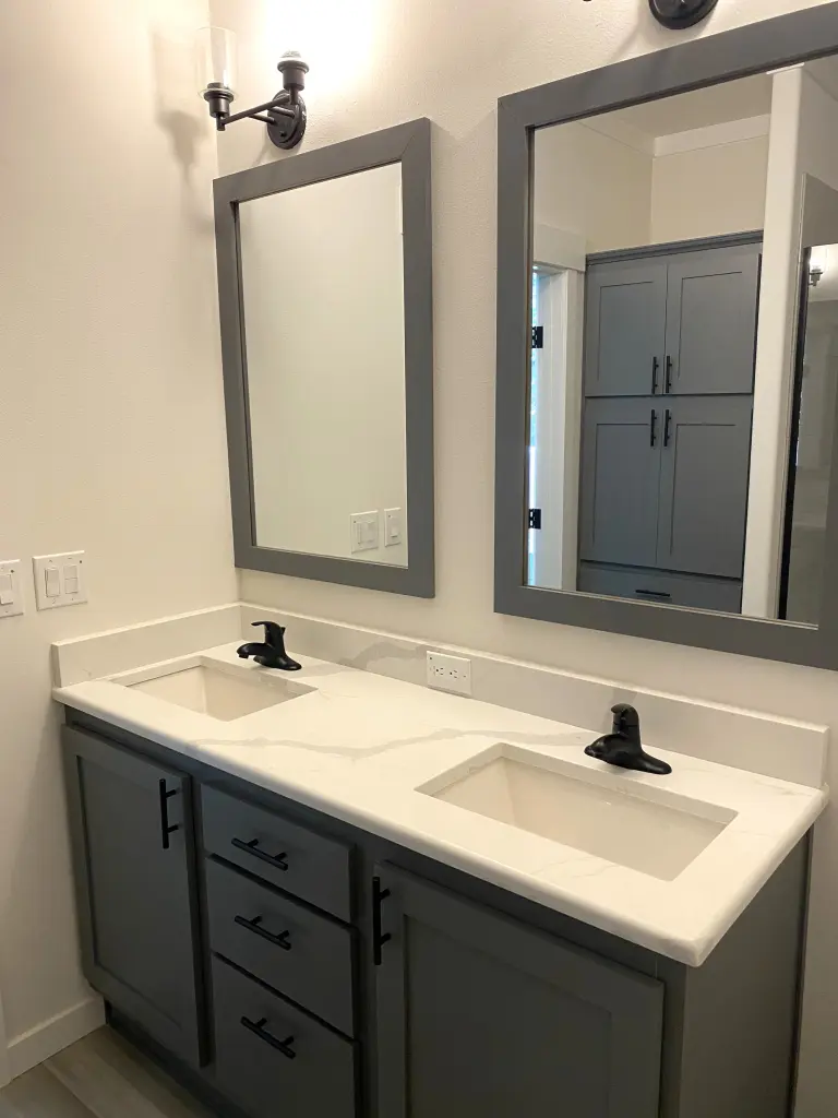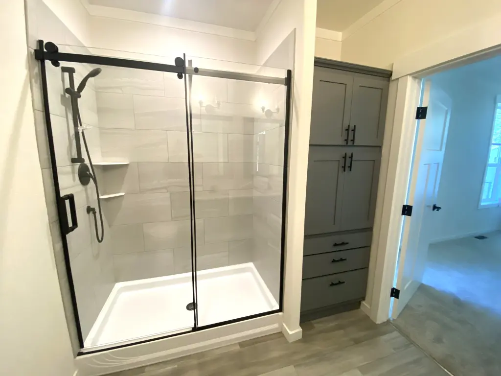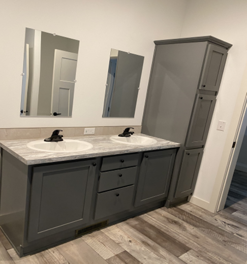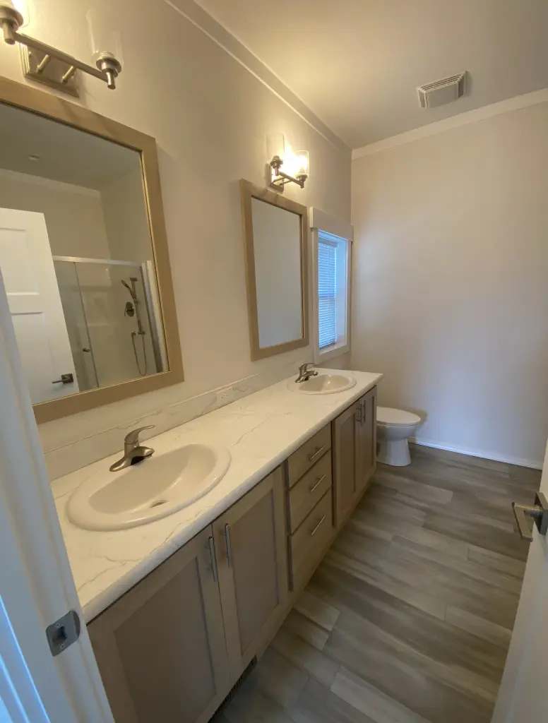 - Master bath with double sinks and walk in 60” COREtec tile in shower