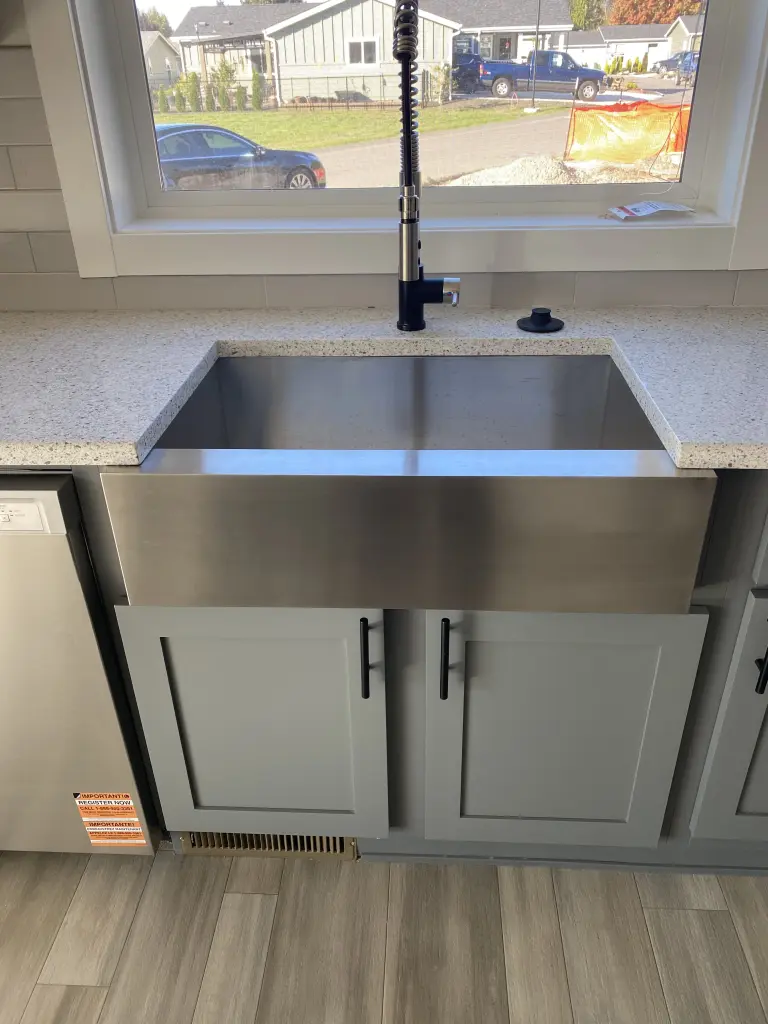 - Beautiful large kitchen with quartz counter tops built in microwave and farm sink